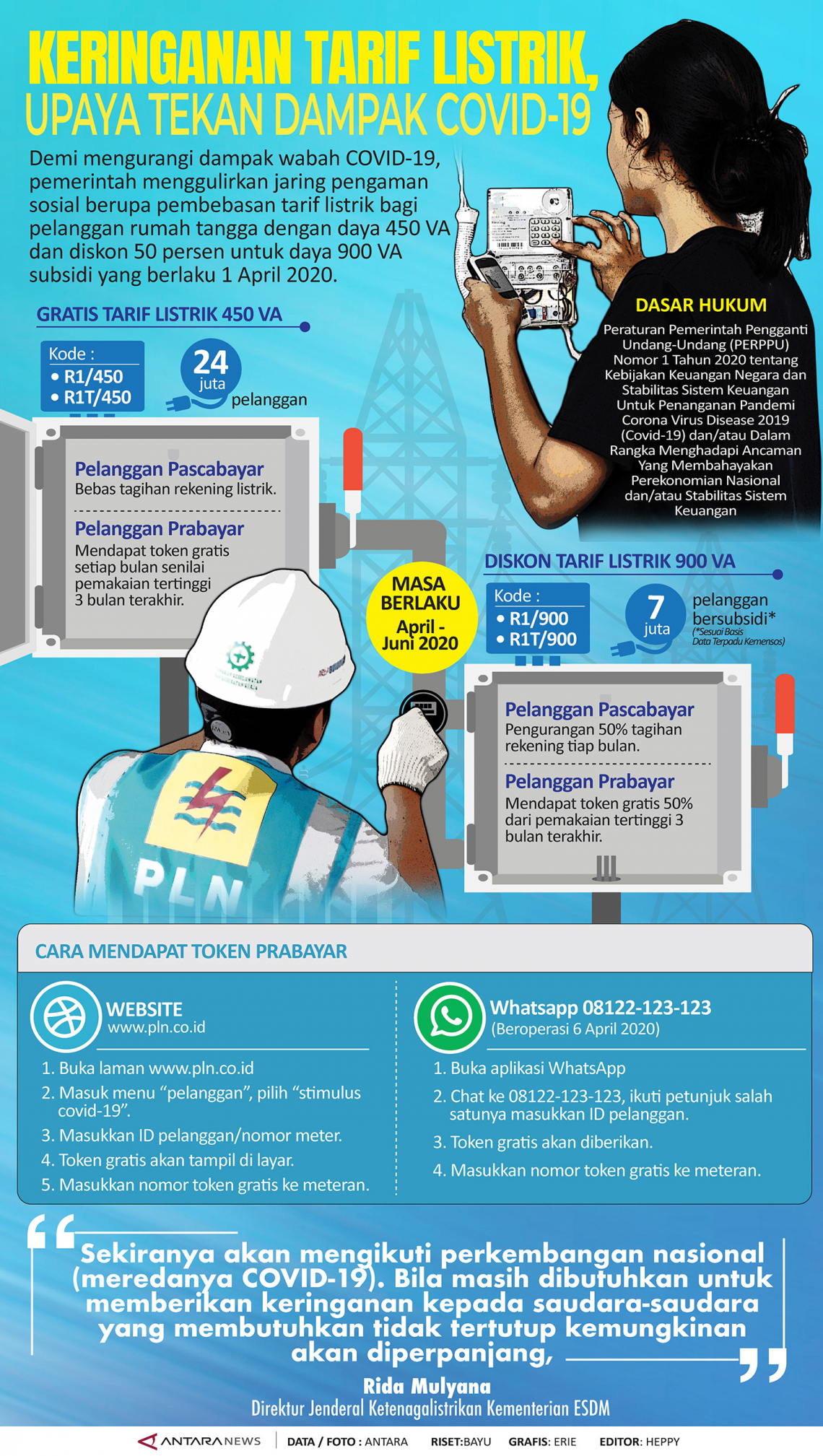 Demi mengurangi dampak wabah COVID-19, pemerintah menggulirkan jaring pengaman sosial berupa pembebasan tarif listrik bagi pelanggan rumah tangga dengan daya 450 VA dan diskon 50 persen untuk daya 900 VA subsidi yang berlaku mulai 1 April 2020.