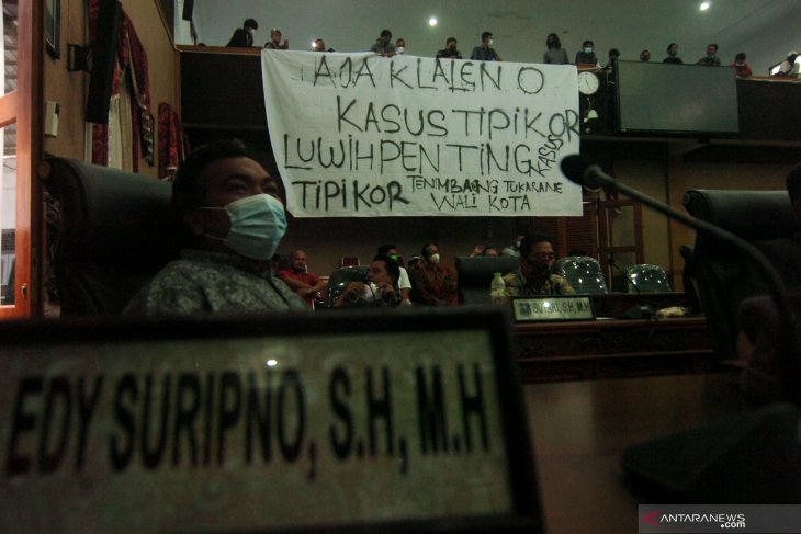 Sejumlah mahasiswa membentangkan spanduk protes saat Rapat Dengar Pendapat di DPRD Kota Tegal, Jawa Tengah, Rabu (3/3/2021). Aksi protes tersebut untuk mengkritik anggota dewan agar membahas kasus korupsi yang ada di Kota Tegal daripada kasus perseteruan antara Wali Kota Tegal Dedy Yon Supriono dan Wakil Wali Kota Tegal Muhamad Jumadi. ANTARA FOTO/Oky Lukmansyah/wsj.