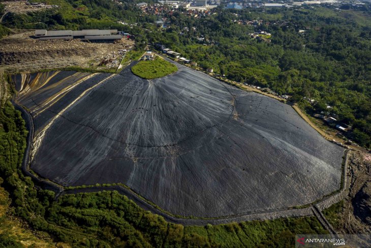 Foto udara lapisan geomembran menutup hamparan lahan bekas timbunan sampah untuk menghasilkan metana pada proyek Pembangkit Listrik Tenaga Sampah (PLTSa) Landfill Gas di Tempat Pembuangan Akhir Jatibarang, Kota Semarang, Jawa Tengah, Sabtu (17/4/2021). Pada tahun 2021 Pemerintah Kota Semarang berencana mengembangkan proyek Pengelolaan Sampah Energi Listrik (PSEL) berteknologi insinerator yang akan menghasilkan 20 Megawatt listrik sebagai upaya mengurangi produksi sampah sekitar 1.000 ton per hari di TPA tersebut. ANTARA FOTO/Aji Styawan/wsj.